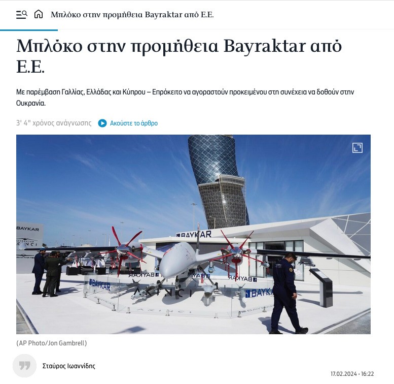 Brüksel’den bir diplomatik kaynak, Yunanistan ve Güney Kıbrıs’ın AB’deki daimi temsilciliklerinin bir süredir konuyla ilgili çalışma yürüttüğünü söyledi. İddiaya göre Yunanistan ve Güney Kıbrıs’tan diplomatlar, Kiev’in Bayraktarların üreticisi Baykar’dan büyük bir sipariş vermeye hazırlandığını ve bu siparişin AB’den alınacak parayla finanse edileceğini gündeme taşıdı.