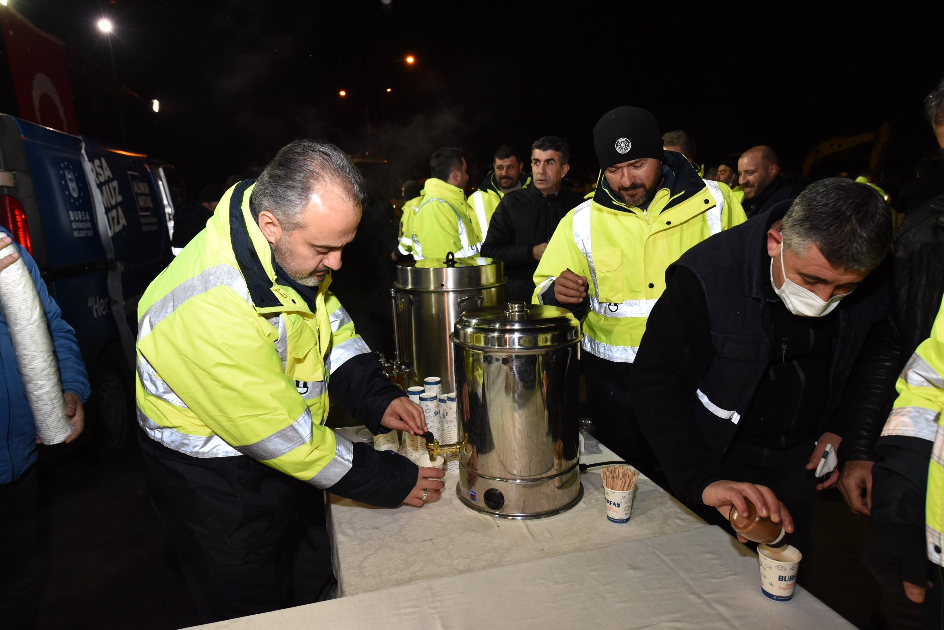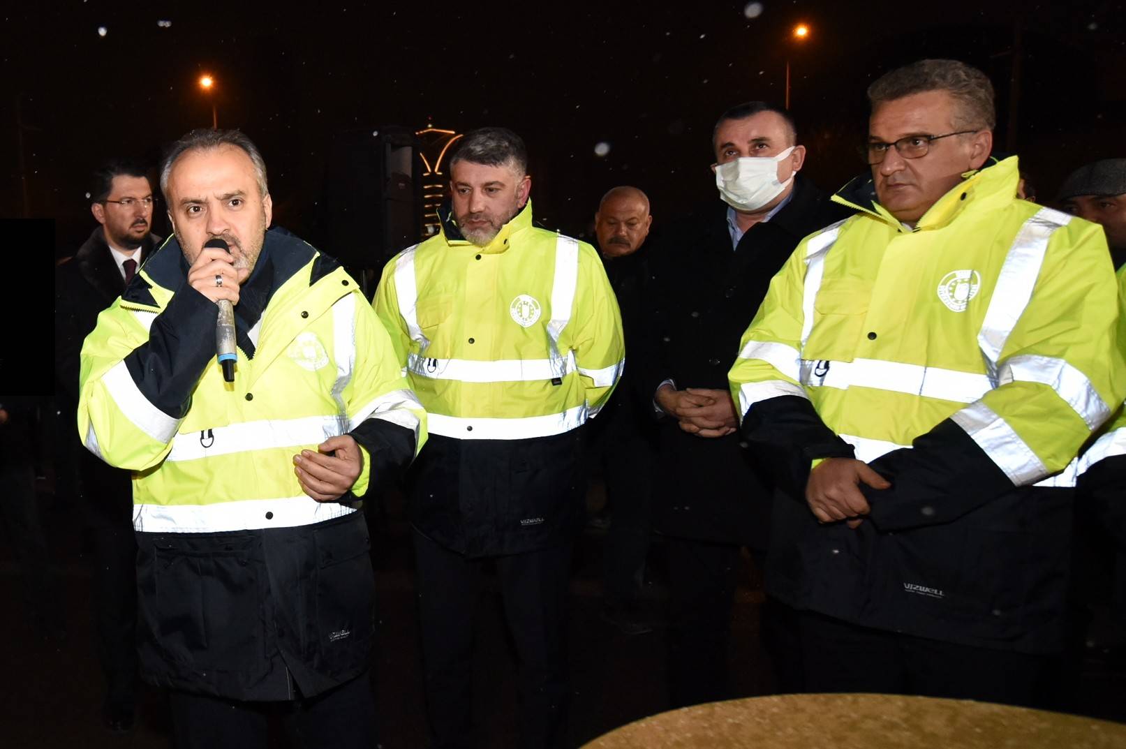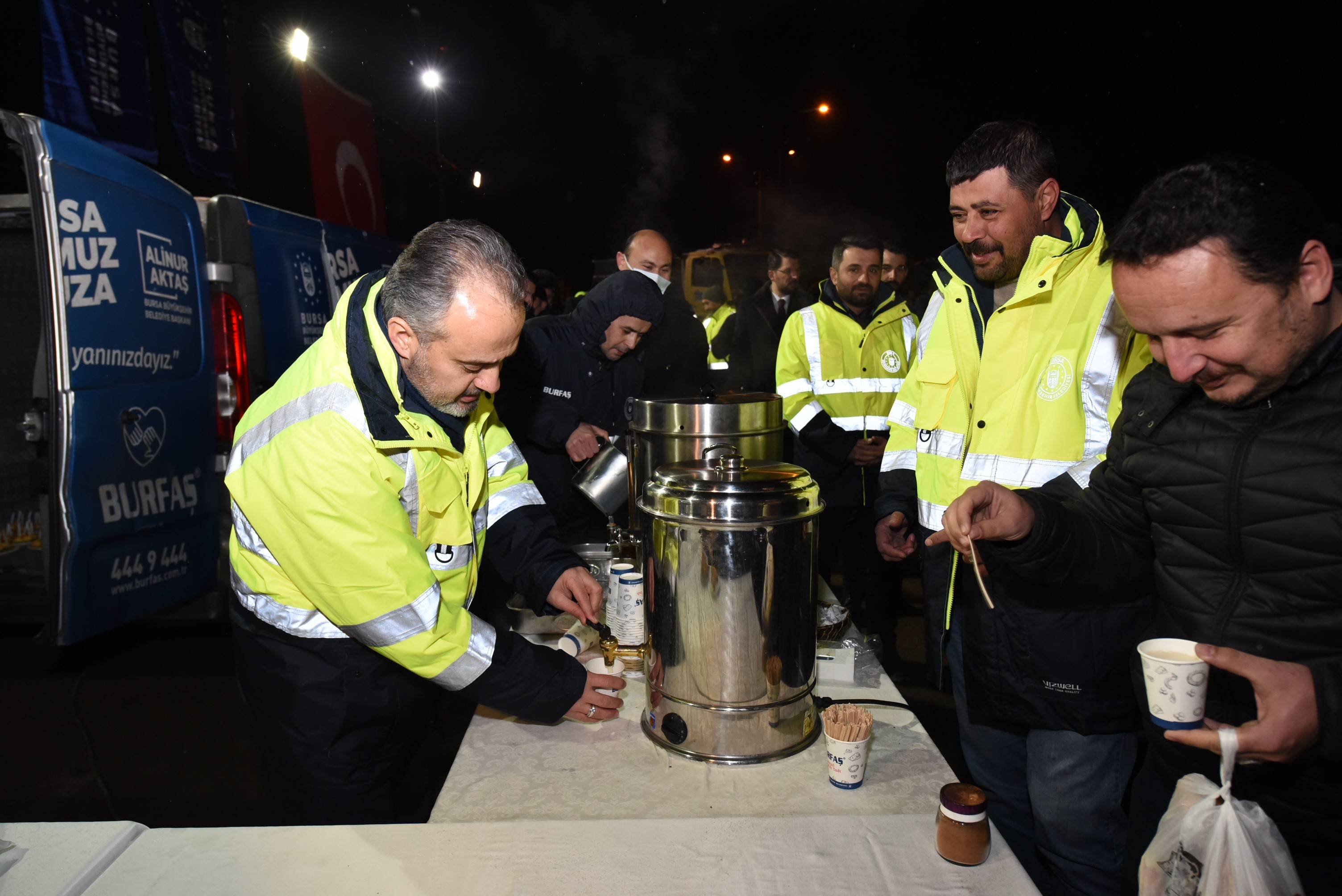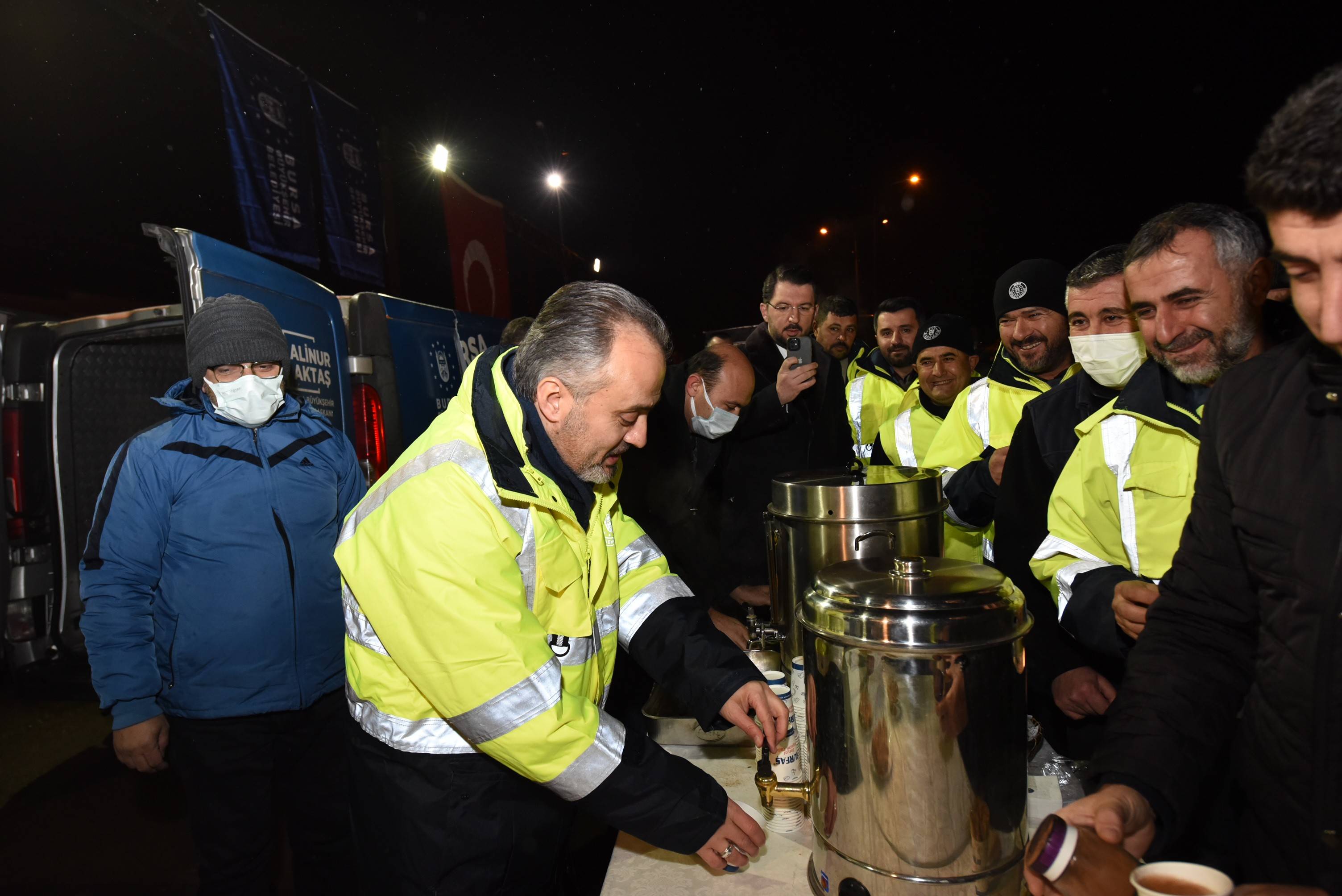 Bursa Büyükşehir Belediye Başkanı Alinur Aktaş, kar yağışının etkili olmaya başladığı ilk günden bu yana gece gündüz büyük bir özveriyle çalışıp, 17 ilçede de ulaşım noktasında sorun yaşatmayan personeli gece yarısı şantiyede ziyaret etti. Şiddetli kar yağışına rağmen Bursa’daki sorunsuz ulaşımın gayretli çalışmayla sağlandığını dile getiren Başkan Aktaş, tüm personele kendi elleriyle salep ikram etti.