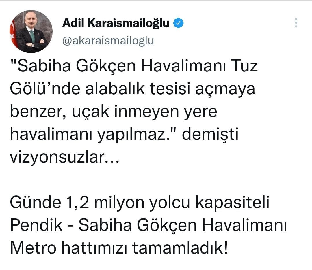 Karaismailoğlu paylaşımında, "Sabiha Gökçen Havalimanı 'Tuz Gölü’nde alabalık tesisi açmaya benzer, uçak inmeyen yere havalimanı yapılmaz' demişti vizyonsuzlar... Günde 1,2 milyon yolcu kapasiteli Pendik - Sabiha Gökçen Havalimanı Metro hattımızı tamamladık!" ifadelerini kullandı.