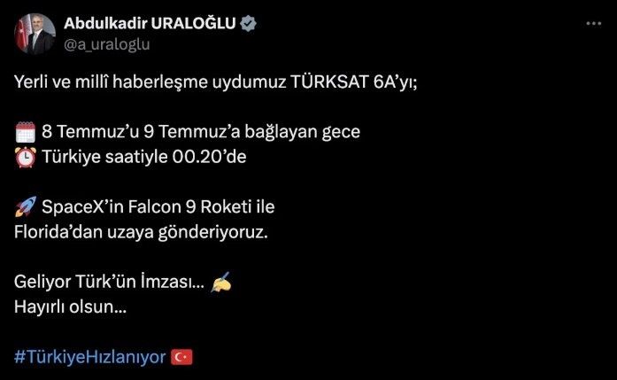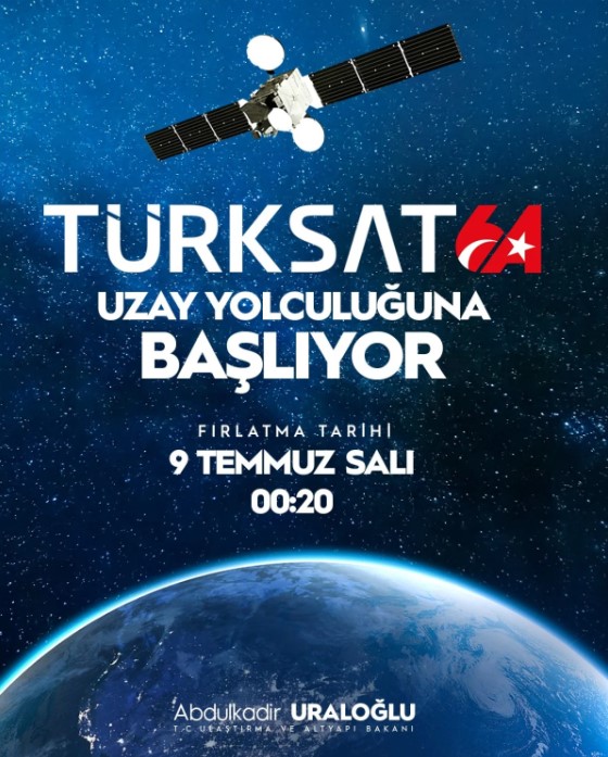 Ulaştırma ve Altyapı Bakanı Abdulkadir Uraloğlu, TÜRKSAT 6A Uydusu’nun 8 Temmuz’u 9 Temmuz’a bağlayacak gece yörüngesine gönderileceğini duyurdu.