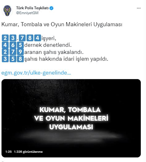 Emniyet Genel Müdürlüğü ile Jandarma Genel Komutanlığı koordinesinde; ülke genelinde 8.749 ekip, 30.073 personelin katılımıyla 28.04.2022 günü “Kumar, Tombala ve Oyun Makineleri” uygulaması yapıldı.