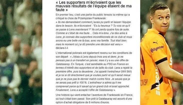 Bununla beraber Frankowski, Galatasaray’ın kendisi için Lens’e 2 kez teklif yaptığını, Fransız kulübünün bu teklifleri kabul etmediğini ancak kabul etmemeleri halinde oynamayacağını söylediğini ifade etti.