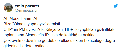 Akşam Gazetesi Ankara Temsilcisi Emin Pazarcı, sosyal medya hesabından çok konuşulacak bir mesaj yayınladı. Mesajında İP Genel Başkanı Meral Akşener'i eleştiren Pazarcı, "Çok evrilme devrilme gördük de ülkücülükten bölücülüğe doğru gidenine ilk defa rastladık" diye yazdı.