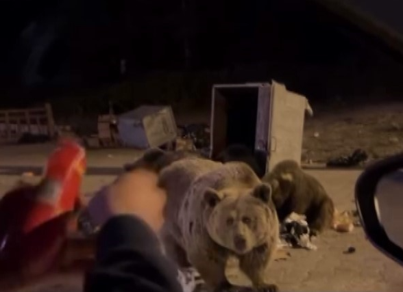 Son olayda, Sarıalan bölgesinde çöp konteynerlerini karıştırırken görüntülenen ayı ailesini gören bir vatandaş, onlara sucuk vermek istedi. Ayılara uzaktan yiyecek atmak yerine, sucuğu eliyle yedirmeye kalkışan vatandaş, büyük bir risk aldı.