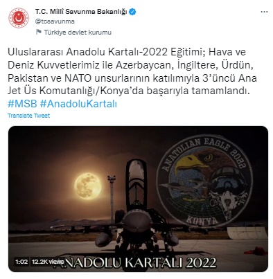 Milli Savunma Bakanlığı (MSB), sosyal paylaşım sitesi Twitter hesabından yaptığı paylaşımda, “Uluslararası Anadolu Kartalı-2022 Eğitimi; Hava ve Deniz Kuvvetlerimiz ile Azerbaycan, İngiltere, Ürdün, Pakistan ve NATO unsurlarının katılımıyla 3’üncü Ana Jet Üs Komutanlığı/Konya’da başarıyla tamamlandı” ifadelerine yer verdi.