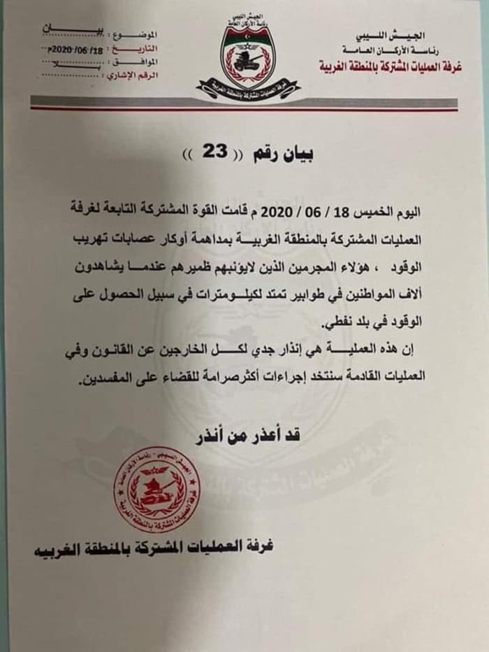Libya'nın Birleşmiş Milletler (BM) nezdindeki meşru temsilcisi Ulusal Mutabakat Hükümeti'ne (UMH) bağlı operasyon odası, ülkenin batı bölgelerindeki petrol kaçakçılarına baskın yapılacağına dair uyarıda bulundu.