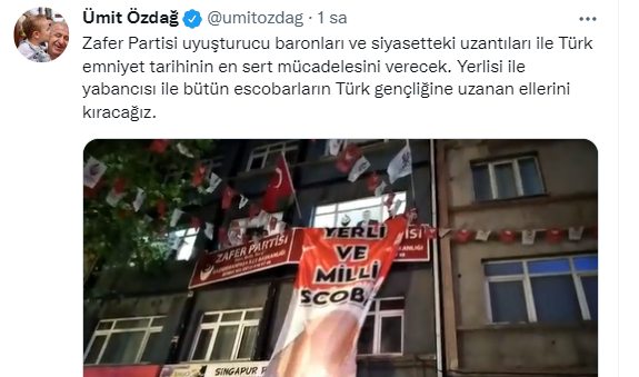 Zafer Partisi uyuşturucu baronları ve siyasetteki uzantıları ile Türk emniyet tarihinin en sert mücadelesini verecek. Yerlisi ile yabancısı ile bütün escobarların Türk gençliğine uzanan ellerini kıracağız.