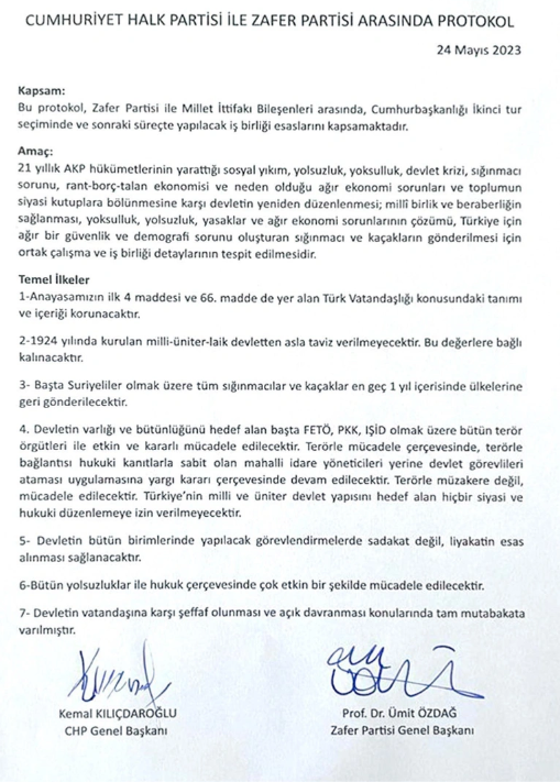 Zafer Partisi Genel Başkanı Ümit Özdağ, Cumhurbaşkanlığı seçimlerinden önce CHP 7. Genel Başkanı Kemal Kılıçdaroğlu ile yapılan ve tartışmalara neden olan gizli protokolü paylaştı.