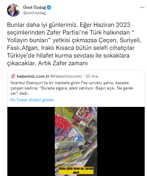 İstanbul Esenyurt'ta kim tarafından ne amaçla markete gönderildiği bilinmeyen Faslı bir genç, marketteki kasiyere, "Neden burada içki satıyorsunuz?" diye sordu. Faslı gence ilişkin haberi Twitter hesabından paylaşan Zafer Partisi Genel Başkanı Ümit Özdağ, on milyonda bir yaşanan provakatif görünümlü olay üzerinden yine ırkçılık yaptı.