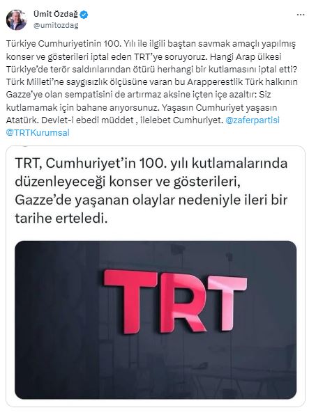 Özdağ yaptığı açıklamada, "Türkiye Cumhuriyetinin 100. Yılı ile ilgili baştan savmak amaçlı yapılmış konser ve gösterileri iptal eden TRT’ye soruyoruz. Hangi Arap ülkesi Türkiye’de terör saldırılarından ötürü herhangi bir kutlamasını iptal etti? Türk Milleti’ne saygısızlık ölçüsüne varan bu Arapperestlik Türk halkının Gazze’ye olan sempatisini de artırmaz aksine içten içe azaltır: Siz kutlamamak için bahane arıyorsunuz. Yaşasın Cumhuriyet yaşasın Atatürk. Devlet-i ebedi müddet , ilelebet Cumhuriyet." ifadelerini kullandı.