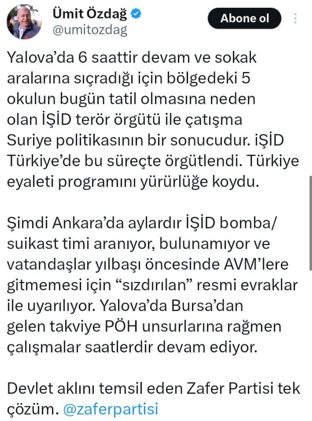 Yalova’da sokak aralarına sızan teröristlerle Özel Harekat Polislerimiz (PÖH) göğüs göğüse çarpışırken, Ümit Özdağ operasyonun henüz sürdüğü sıcak saatlerde provokatif bir dil kullanmayı tercih etti. Bölgedeki okulların tatil edilmesini ve güvenlik önlemlerini diline dolayan Özdağ, devletin terörle mücadelesini hedef alarak, paylaşımının sonuna "Zafer Partisi tek çözüm" notunu düştü.