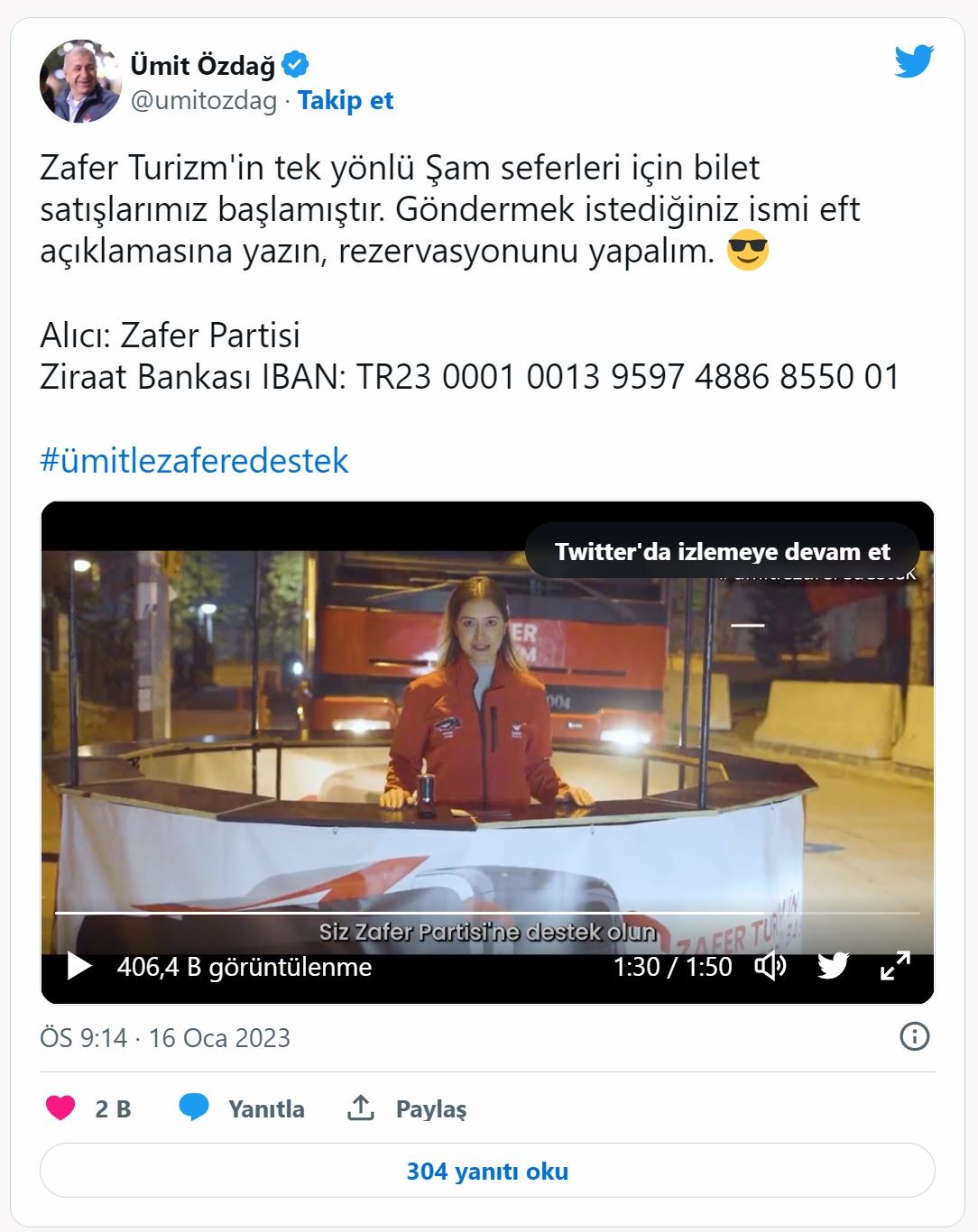 Suriyeli sığınmacılarıyla ilgili yaptığı provokatif paylaşımlarla gündeme gelen Zafer Partisi Genel Başkanı Ümit Özdağ paylaşımında, "Zafer Turizm'in tek yönlü Şam seferleri için bilet satışlarımız başlamıştır. Göndermek istediğiniz ismi eft açıklamasına yazın, rezervasyonunu yapalım." ifadelerini kullandı.