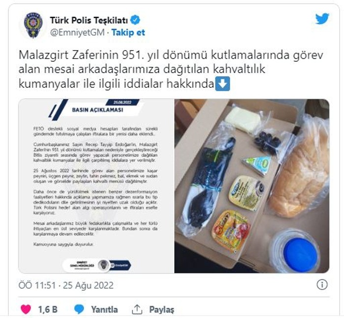 Cumhurbaşkanımız Sayın Recep Tayyip Erdoğan'ın, Malazgirt Zaferi'nin 951. yıl dönümü kutlamaları nedeniyle gerçekleştireceği Bitlis ziyareti sırasında görev yapacak personelimize dağıtılan kahvaltılık kumanyalar ile ilgili çarpıtılmış iddialara yer verilmiştir.