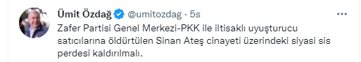 Özdağ asılan pankartı Twitter hesabından şu mesajla paylaştı: Zafer Partisi Genel Merkezi-PKK ile iltisaklı uyuşturucu satıcılarına öldürtülen Sinan Ateş cinayeti üzerindeki siyasi sis perdesi kaldırılmalı.