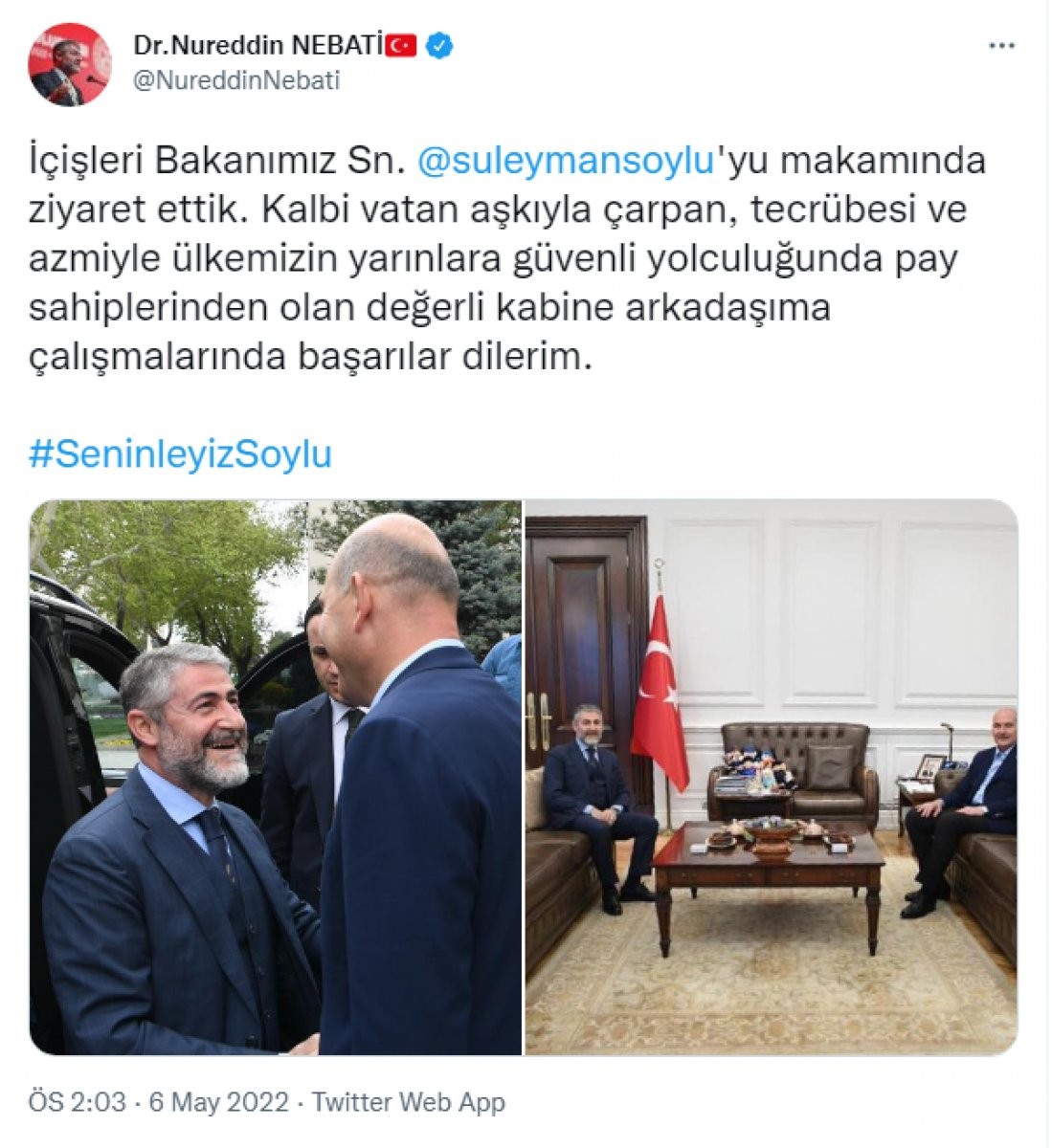 Ziyareti Twitter hesabından duyuran Bakan Nebati, "İçişleri Bakanımız Sn. Süleyman Soylu'yu makamında ziyaret ettik. Kalbi vatan aşkıyla çarpan, tecrübesi ve azmiyle ülkemizin yarınlara güvenli yolculuğunda pay sahiplerinden olan değerli kabine arkadaşıma çalışmalarında başarılar dilerim." ifadelerini kullandı.