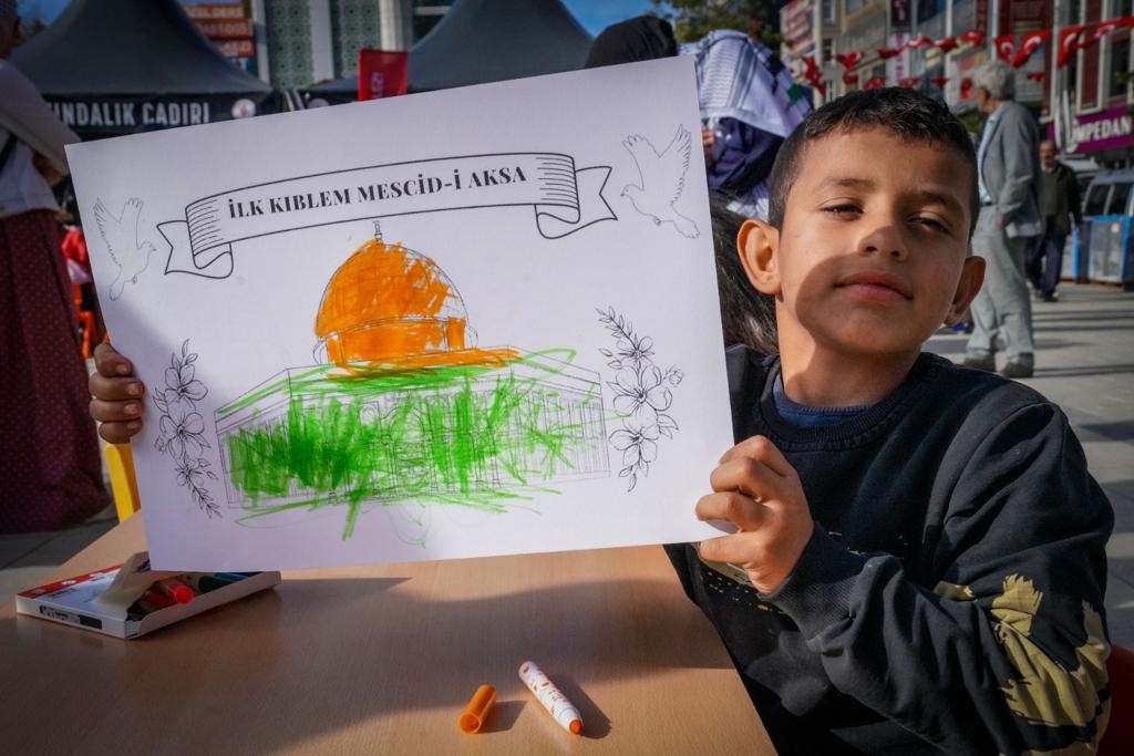 Filistin’i çok sevdiğini söyleyen 4 yaşındaki Nazlı Gül Şahin, “Bugün Filistin için boyama yaptık. Filistin’deki kardeşlerimizi çok seviyoruz. İnşallah kardeşlerimiz kurtulur” dedi.
