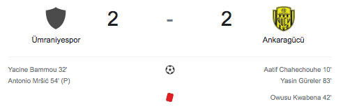 Ümraniyespor - Ankaragücü maçı, 2-2'lik beraberlikle son buldu. Mücadelenin açılı golü 10. dakikada Aatif Chahechoue'dan geldi. 32'de Yacine Bammou skoru eşitledi.