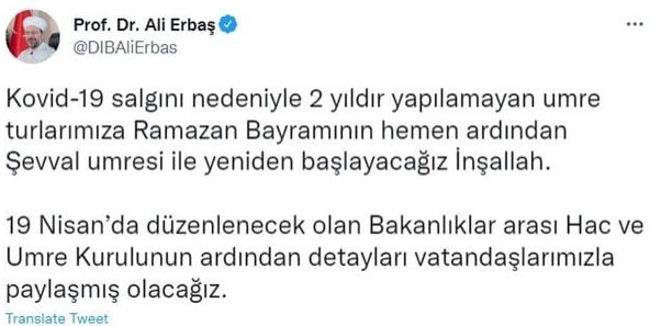Diyanet İşleri Başkanı Ali Erbaş, "Umre konusunda artık Türkiye'de vaka sayılarının çok düştüğünü ve umreye gitmek isteyen vatandaşlarımız olduğunu, çok arzulu olduklarını bildirdik. Onlar da Türkiye'deki vaka sayılarının düşmesini dikkate alarak umreyi açtılar. Bundan sonra umre serbest, arzu eden herkes umreye gidebilir. Ramazan Bayramı sonrası için planlamalarımıza başladık" demişti.