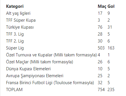 Milli futbolcu, futbol kariyerine başladığından bu yana 503'ü Süper Lig, 32'si Fransa Birinci Futbol Ligi (Ligue 1), 25'i Avrupa Şampiyonası Elemeleri (Ümit Milli Takım maçları da dahil), 10'u da Dünya Kupası Elemeleri olmak üzere toplam 754 kez forma şansı buldu.