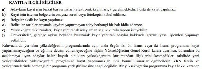 ÖSYM YKS 2020 tercih sonuçlarına göre, üniversite tercih tarihlerinde yapılan YKS tercihleri arasından herhangi bir önlisans ya da lisans programlara yerleşmeye hak kazanan adaylar açıklanan tarihlerde üniversite kayıtlarını yapacak. Üniversite kayıtları iki şekilde yapılmakta. Birincisi adaylar üniversite kayıtlarını e devlet üzerinden yapabilecekler. e devlet üzerinden yapılan kayıtlar tamamlandığında telefon numaranıza kayıt olduğunuz üniversite tarafından SMS mesajı gelecektir. Bu mesajda üniversiteye kayıt işleminin başarılı bir şekilde yapıldığını ifade etmektedir. İkincisi ise adayın kazandığı üniversiteye bizzat başvurarak kayıtlarını yaptırabilecekler.