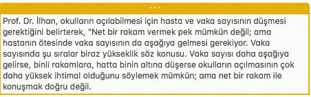 Bilim Kurulu üyesi Prof. Dr. İlhan, üniversitelerin eğitime çevrimiçi devam ettiğini, bazı programlarda ise yüz yüze eğitim yapıldığını belirterek, "Hem öğrencilerde hem de velilerde iki ayrı görüş mevcut. Bir grup özellikle, 'üniversiteler açılsın, tamamen yüz yüze olsun' derken, bir grup ise 'tamamen çevrimiçi olsun' diyor. Her iki grubun da kendince haklı gerekçeleri var. Ama doğru olan şu; rakamların gidişatına bakıp her üniversite kendi olanakları, kendi yeterlilikleri, yürüttükleri eğitim programları dahilinde eğitimin 'çevrimiçi+yüz yüze' ya da sadece 'yüz yüze' olacağına karar vermesi gerekecek. Üniversiteler kendi kararları ile bu süreci yönlendirecekler. Her üniversitenin kendi programını kendisi yaparak ilerlemesi doğru olacaktır" diye konuştu.