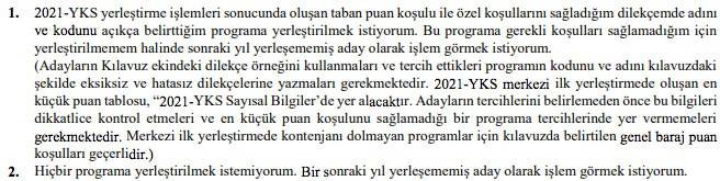 Dilekçelerinde 1. seçeneği belirten adaylar yalnızca bir programa (BURSLU programlar hariç) yerleştirilme talebinde bulunabilecek olup tercihte bulundukları programa kontenjan harici yerleştirileceklerdir. Birden fazla program tercihinde bulunan adayların yalnızca birinci sıradaki program tercihi işleme alınacaktır. Dilekçesinde yer alan programa yerleşen ve bu programa da belirtilen sebeplerle kayıt hakkı kazanamayan adaylar bir sonraki yıl yerleşmiş aday olarak işleme alınacaklardır.
