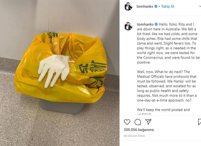 Amerika Birleşik Devletleri vatandaşı (ABD) ünlü oyuncu Tom Hanks ve eşi Rita Wilson'a koronavirüs bulaştı.