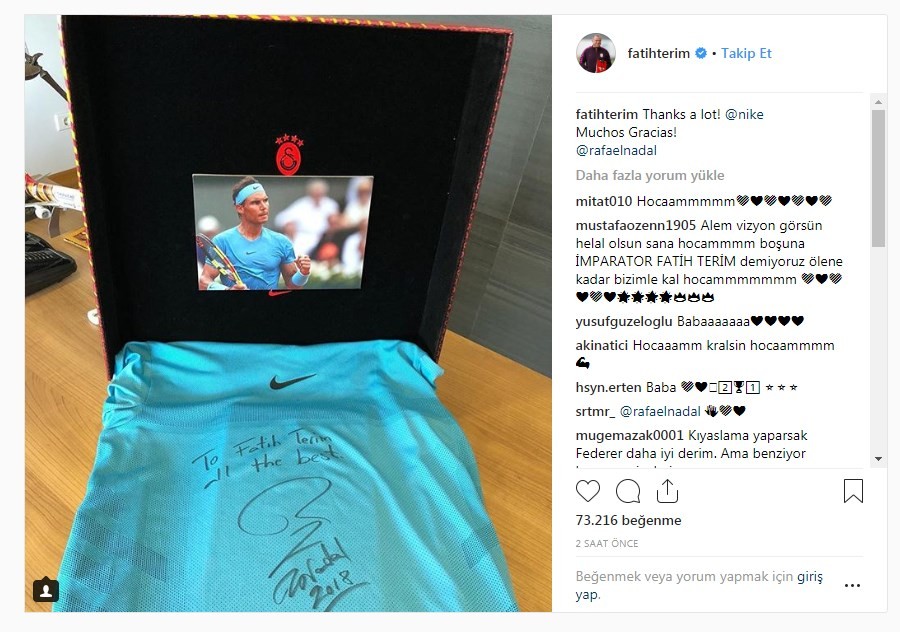 Nadal'dan gelen hediyeyi Instagram hesabı üzerinden takipçileriyle paylaşan Terim, paylaşım yaptığı gönderiye "çok teşekkürler" notunu düştü.