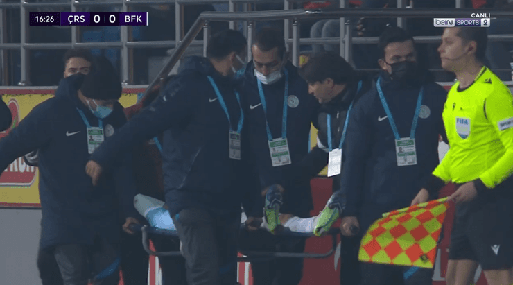 Oyuna devam edemeyen ve sedyeyle kenara alınan 30 yaşındaki kanat oyuncusu, tomografisi çekilmek üzere hastaneye götürüldü.