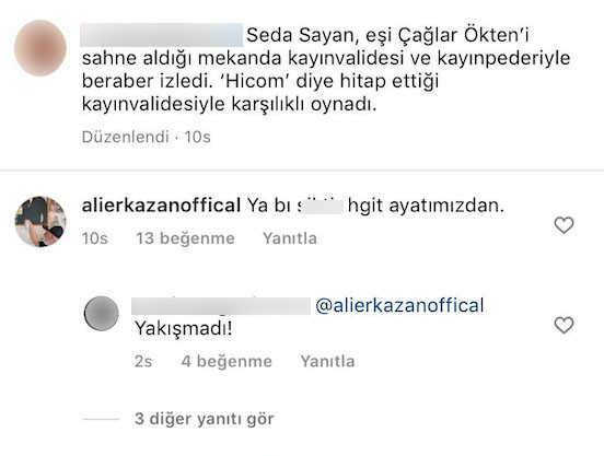 59 yaşındaki şarkıcı Seda Sayan, 7. evliliğini yaptığı kendisinden 25 yaş küçük müzisyen eşi Çağlar Ökten'in sahnesini kayınvalidesi ve kayınpederiyle birlikte izlemeye gitti. Sayan, eşinin konserinde 'Hicom' diye hitap ettiği kayınvalidesi Hicran Ökten ile karşılıklı göbek attı. Sayan'ın kayınvalidesiyle birlikte çekilen görüntüleri sosyal medyada geniş yer buldu. Bir Instagram sayfasında Sayan ve kayınvalidesi Hicran Ökten'in görüntüleri paylaşıldı. Oyuncu Ali Erkazan ise o görüntülere şoke eden bir yorumda bulundu. Sayan'ın sürekli aşk hayatıyla gündeme gelmesine sinirlenen Ali Erkazan, ''Ya bi s.... git hayatımızdan'' dedi. Ünlü oyuncu, yaptığı yorumla görenleri şoke etti.
