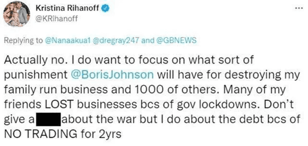 Rihanoff, "Boris Johnson'ın ailemin işlettiği işletmeyi ve diğer 1000 kişiyi yok ettiği için ne tür bir ceza alacağını merak ediyorum. Arkadaşlarımın çoğu, hükümet kısıtlamaları nedeniyle işlerini kaybetti. Savaş umurumda değil (orijinal metin 'Savaş s...mde değil' anlamında) ama iş yapamadığım için borçlarım birikiyor" dedi ve küfürlü bir ifadeyle tepkisini dile getirdi.