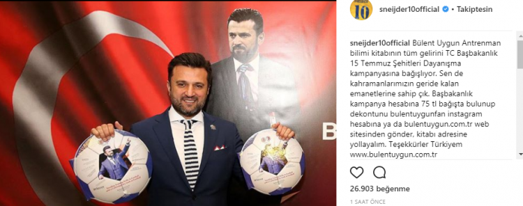 1 Mart 2018'de yayınlanacak kitap için 15 Temmuz Şehitleri'ne destek kararı alan Bülent Uygun'a Al Gharafa'da öğrencisi olan Wesley Sneijder de destek oldu. Uygun'un bu kampanyasını sosyal medyadan takipçileriyle paylaşan Sneijder, herkesi şehit ailelerine destek olmaya davet etti.