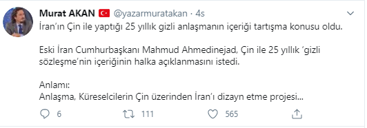 İran’ın Çin ile yaptığı 25 yıllık gizli anlaşmanın içeriği ile ilgili yazar Murat Akan’dan dikkat çeken tweet geldi.