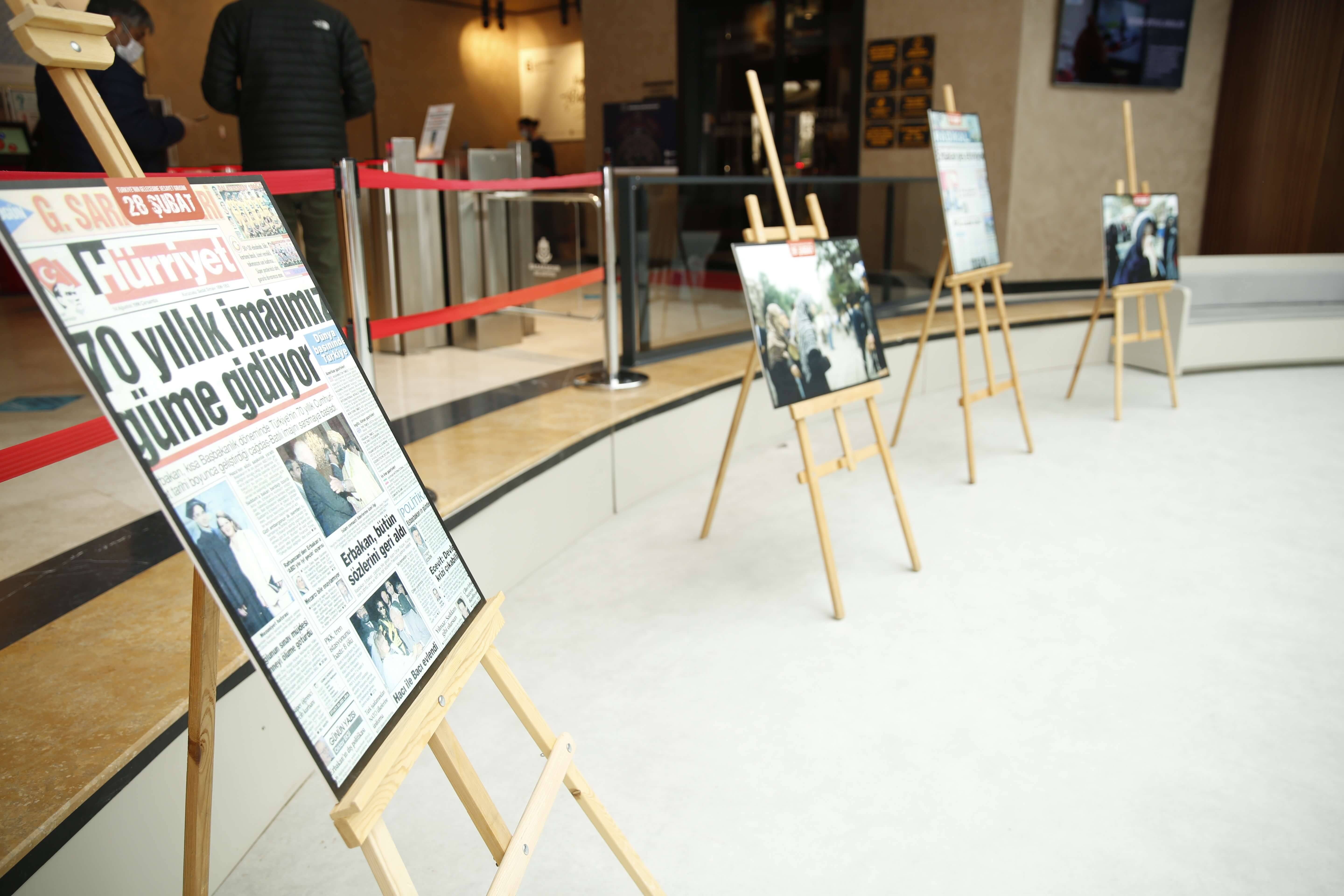 Dönemin darbecilere destek veren medyası tarafından atılan manşetlerin de yer aldığı sergide, başörtüleri sebebi ile eğitim hakları gasbedilen öğrencilerin resimleri de bulunuyor.