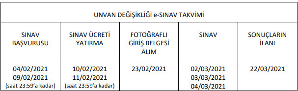 Milli Eğitim Bakanlığı personeline yönelik 02-03-04 Mart 2021 tarihlerinde yapılacak olan unvan değişikliği yazılı sınavı, e-Sınav olarak yapılacak olup başvuru şartları Ek'teki Kılavuzlarda açıklandı. Daha önce başvuruda bulunanlarla birlikte, gerek daha önce başvuruda bulunamayanların, gerekse başvuruda bulunup sınav ücretini yatıramayanların ve bu sınava ilişkin başvuru şartlarını sonradan kazananların tamamı Millî Eğitim Bakanlığı Bilişim Sistemleri (MEBBİS) başvuru ekranından giriş yapabileceklerdir. Milli Eğitim Bakanlığı merkez ve taşra teşkilatında norm kadro açığı ile hizmet gereklerine göre münhal kadrolar için yapılacak unvan değişikliği yazılı sınavı,Ölçme, Değerlendirme ve Sınav Hizmetleri Genel Müdürlüğü (ÖDSGM) tarafından 02 ‐ 04 Mart 2021 tarihleri arasında MEB e‐Sınav salonlarında elektronik olarak 81İl e‐Sınav merkezlerinde uygulanacaktır.