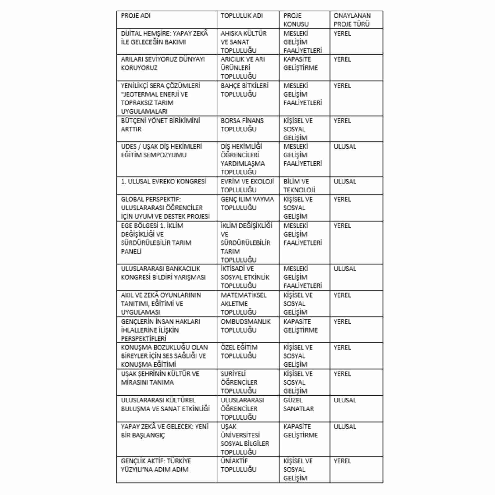 Uşak Üniversitesi’nin bilim ve teknoloji, güzel sanatlar, kişisel ve sosyal gelişim, uluslararası çalışmalar, kapasite geliştirme, mesleki gelişim faaliyetleri kapsamında başvuru yapan toplam 30 projesinden; 5 ulusal, 11 yerel olmak üzere 16 projesi destek alma başarısı gösterdi.