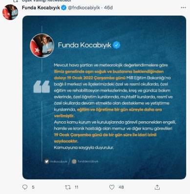 Uşak Valiliği sosyal medya hesaplarından yapılan açıklamada hava şartları ve meteorolojik veriler dikkate alınarak bugün il genelinde Milli Eğitim Bakanlığı'na bağlı özel ve resmi okullar, özel eğitim ve rehabilitasyon merkezleri, özel öğretim kursları, muhtelif kurslar ve yetiştirme kurslarında eğitim ve öğretime 18 Ocak Salı günü bir gün süreyle ara verildiği belirtildi.