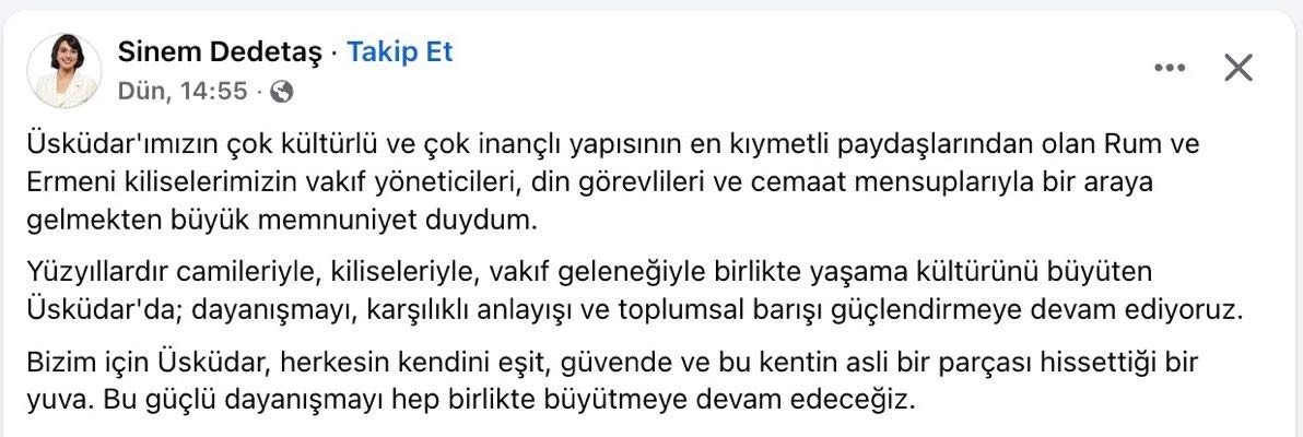 Buluşmayı sosyal medya hesabından duyuran Dedetaş, “Üsküdar'ımızın çok kültürlü ve çok inançlı yapısının en kıymetli paydaşlarından olan Rum ve Ermeni kiliselerimizin vakıf yöneticileri, din görevlileri ve cemaat mensuplarıyla bir araya gelmekten büyük memnuniyet duydum” dedi. Üsküdar'ın çok kültürlü bir yapısı olduğunu vurgulayan Dedetaş, “Bizim için Üsküdar, herkesin kendini eşit, güvende ve bu kentin asli bir parçası hissettiği bir yuva. Bu güçlü dayanışmayı hep birlikte büyütmeye devam edeceğiz” ifadelerini kullandı.