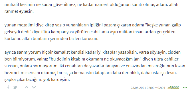 Söz konusu kesimler tarafından vefatının ardından bile çirkin hakaretlere maruz kalan, kabrinde dahi birilerini kudurtan Merhum Üstad Mısıroğlu, Ekşi Sözlük yazarları tarafından Rahmetle yad edildi.