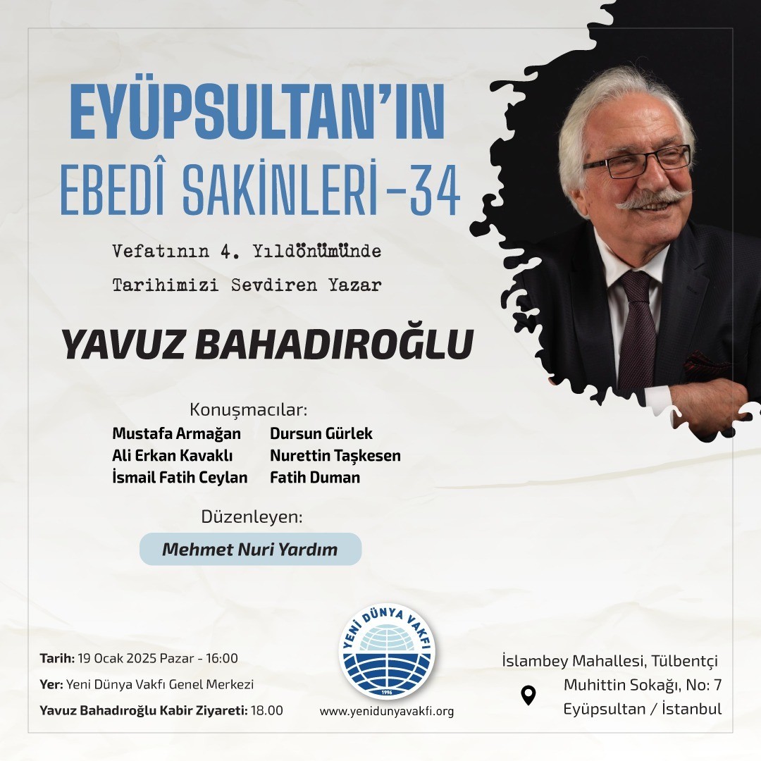 Osmanlı tarihine dair eserleriyle tanınan aynı zamanda Yeniakit Gazetesi'nde köşe yazıları da kaleme alan Yavuz Bahadıroğlu, vefatının 4. yılında anılıyor. "Eyüpsultan’ın Ebedî Sakinleri" programının 34. etkinliği kapsamında düzenlenen anma programı, 19 Ocak 2025 Pazar günü Yeni Dünya Vakfı Genel Merkezi'nde gerçekleştirilecek.