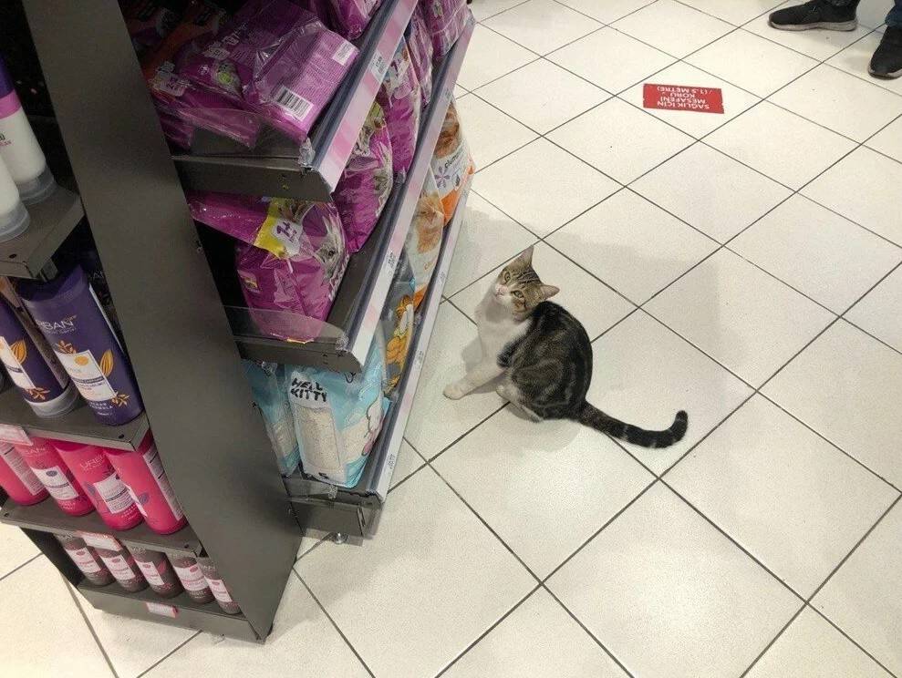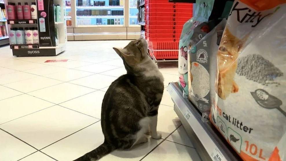 Kadıköy'de bulunan bir markette, çalışanların "Nokta" ismini verdikleri kedi, mama reyonunun önünde bir an olsun ayrılmıyor.