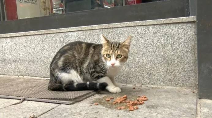 Kadıköy'de bir markete giren kedi, mama reyonunun önünde patisini kaldırarak sakat taklidi yapıyor. Kedinin hareketlerine acıyan müşteriler ise mama almak zorunda kalıyor.