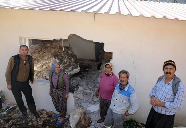 Mersin'in Erdemli İlçesi'nde dağdan kopan yaklaşık 10 ton ağırlığındaki kaya, evin penceresinden oturma odasına girdi.
