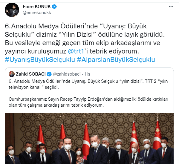 Dizi yapımcısı Emre Konuk sosyal medya hesabından dikkat çeken bir paylaşımda bulundu. 6.Anadolu Medya Ödülleri’nde “Uyanış: Büyük Selçuklu” dizisi yılın dizisi ödülüne layık görüldü.