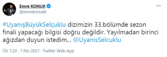 Sezon Final yapacağı söylentilerinin gerçeği yansıtmadığını belirten Emre Konuk, "Uyanış Büyük Selçuklu dizimizin 33.bölümde sezon finali yapacağı bilgisi doğru değildir. Yayılmadan birinci ağızdan duyun istedim..." ifadelerini kullandı.