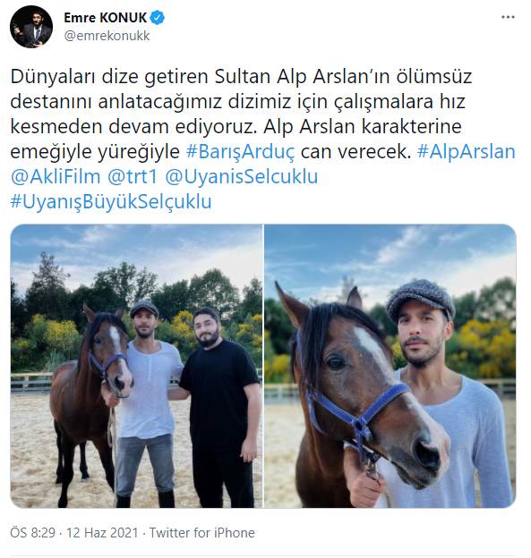 Emre Konuk, Barış Arduç ile fotoğraflarını paylaşarak, 'Dünyaları dize getiren Sultan Alparslan'ın ölümsüz destanını anlatacağımız dizimiz için çalışmalara hız kesmeden devam ediyoruz. Alp arslan karakterine emeğiyle yüreğiyle Barış Arduç can verecek' dedi