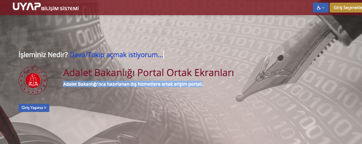 Adalet Bakanlığı'nca hazırlanan dış hizmetlere ortak erişim portalı avukat.uyap.gov.tr Adalet Bakanlığı bünyesinde yürütülen avukatların yargı ve dava işlemlerini yürüttüğü sistemdir. UYAP avukat sistemi, Adalet Bakanlığı'nca hazırlanan dış hizmetlere ortak erişim portalıdır.
