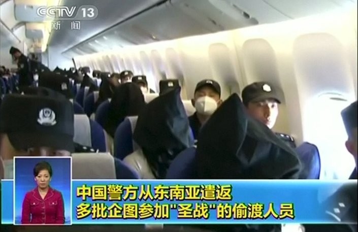 Çin Devlet Televizyonu, Tayland'ın iade ettiği 115 Uygur Türkünün Çin'e götürülme anının görüntülerini yayınladı.