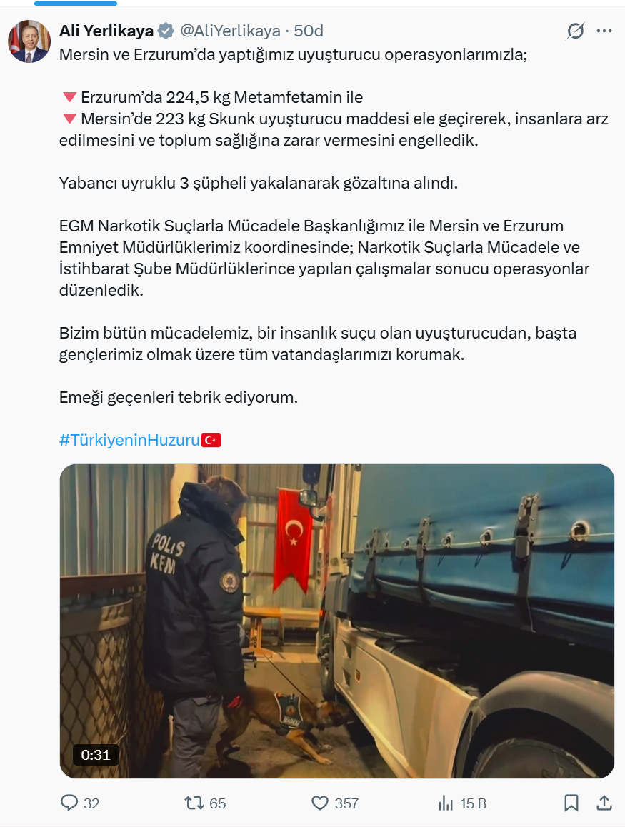 İçişleri Bakanı Ali Yerlikaya, güvenlik güçlerinin zehir tacirlerine göz açtırmadığını belirterek Erzurum ve Mersin’de düzenlenen başarılı operasyonların detaylarını paylaştı. Bakan Yerlikaya’nın açıklamasına göre, Erzurum’da tam 224,5 kilogram metamfetamin, Mersin’de ise 223 kilogram skunk ele geçirildi.