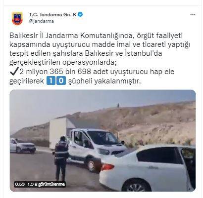Jandarma Genel Komutanlığı resmi sosyal medya hesabından yapılan paylaşımda "Balıkesir İl Jandarma Komutanlığınca, örgüt faaliyeti kapsamında uyuşturucu madde imal ve ticareti yaptığı tespit edilen şahıslara Balıkesir ve İstanbul'da gerçekleştirilen operasyonlarda; i2 milyon 365 bin 698 adet uyuşturucu hap ele geçirilerek 10 şüpheli yakalanmıştır” ifadelerine yer verildi.